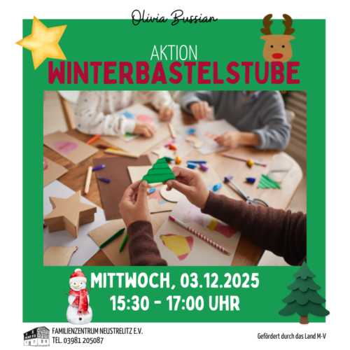 In unserer gemütlichen Winterbastelstube für die ganze Familie nehmen wir uns Zeit zum Gestalten von weihnachtlichen und winterlichen Basteleien. Plätzchen und warme Getränke versüßen uns die […]