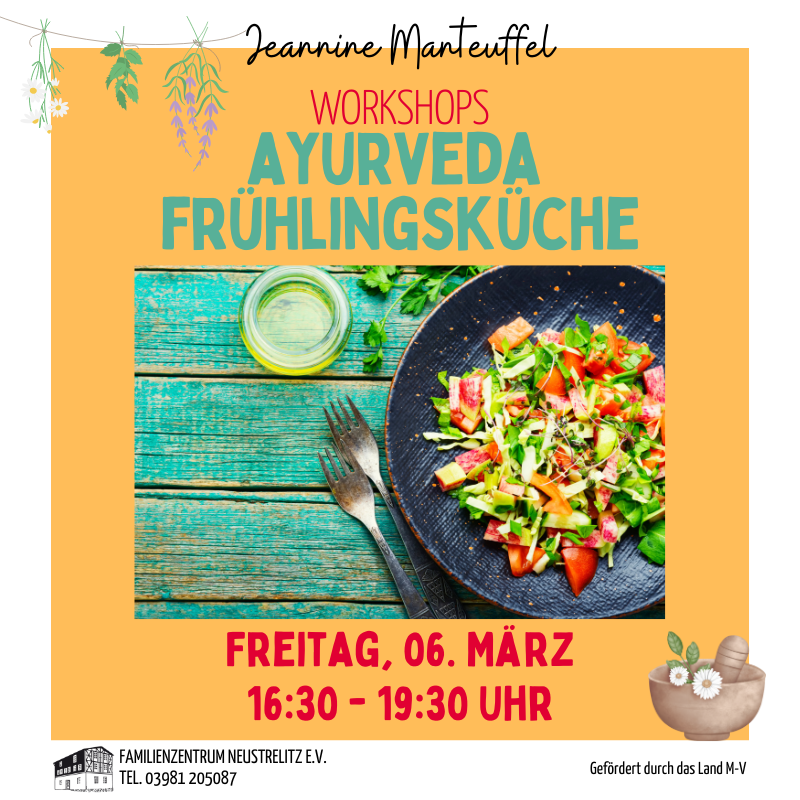 Es wird ein leckeres und alltagstaugliches ayurvedisches Frühlingsmenü gekocht, bestehend aus einer Vorspeise, einem Hauptgericht mit verschiedenen Beilagen und einem Dessert. Der Kochabend besteht aus einem kleinen Coachingteil mit wertvollen Tipps und Empfehlungen für die Ernährung im Winter und dem gemeinsamen Kochen und Ausprobieren.